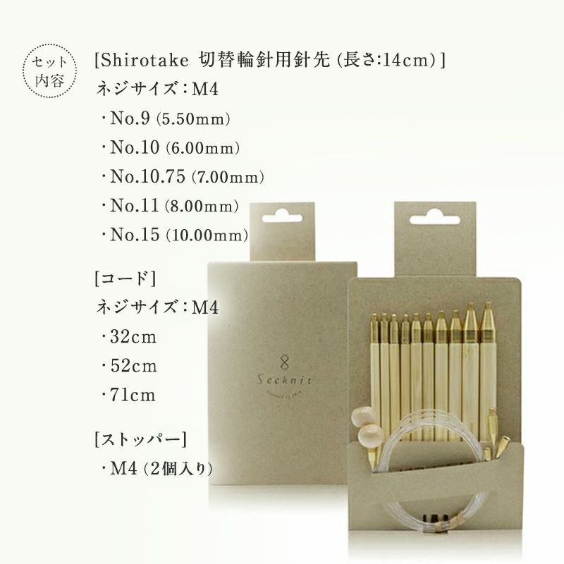 他の画像を見る Seeknit Shirotake 切替輪針 12.5cm Mセット 紙ケース ≪海外サイズ≫ 当店特別価格 ¥ 5,643 税込 販売期間 2022/10/01 20:00 〜 カートに入れる お気に入りに登録する